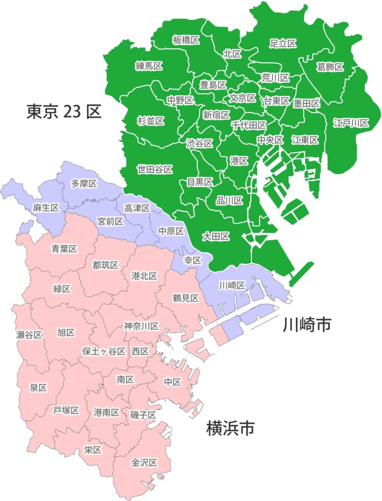 | 神奈川県 | <横浜市> 青葉区、旭区、泉区、磯子区、神奈川区、金沢区、港南区、栄区、瀬谷区、都筑区、鶴見区、戸塚区、中区、西区、保土ヶ谷区、緑区、南区 <川崎市> 麻生区、川崎区、幸区、高津区、多摩区、中原区、宮前区 |